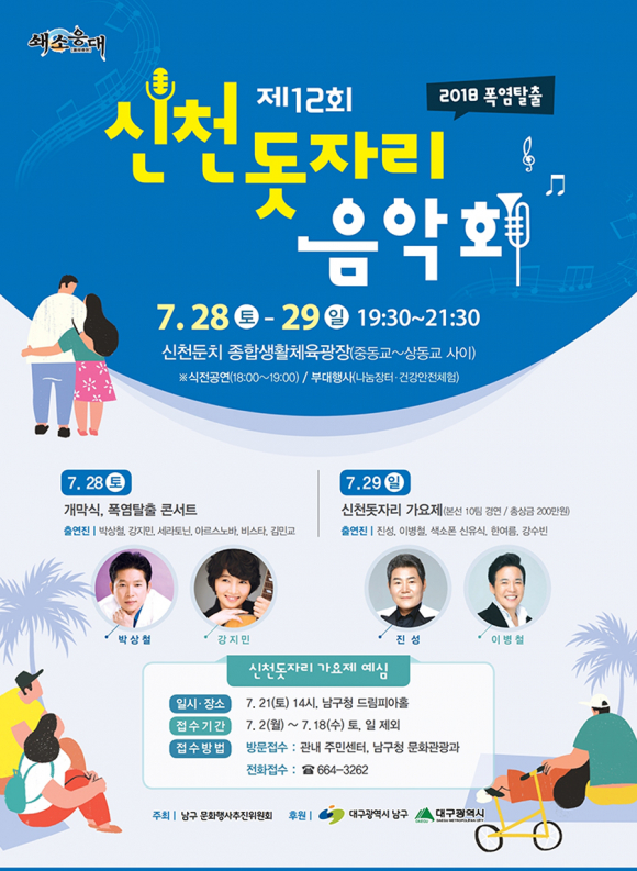 2018 폭염탈출 제12회 신천돗자리음악회가 7.28(토) ~ 7.29(일) 까지 신천둔치 종합생활체육광장(중동교 ~ 상동교)에서 열린다.