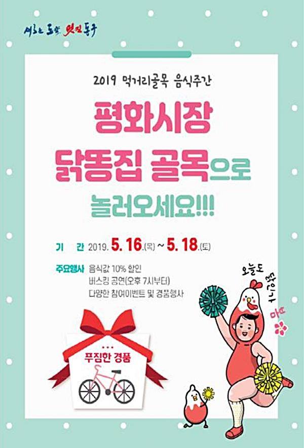 대구광역시 동구청에서는 오는 16일부터 18일까지 3일간 40여년 역사가 있는 평화시장 닭똥집골목에서 먹을거리, 볼거리, 즐길 거리 가득한 음식주간 행사가 기다리고 있다.