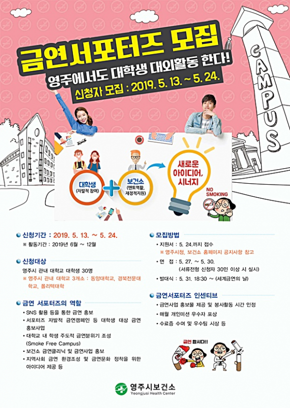 영주시보건소(소장 김인석)는 5월 24일까지 영주시 관내 대학교 학생을 대상으로 2019년 대학생 금연 서포터즈를 모집한다.