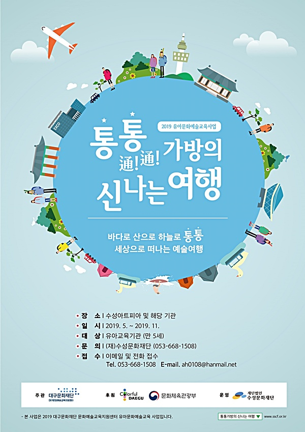 수성문화재단(이사장 김대권)은 5월 20일부터 수성구 내 20개 어린이집, 유치원을 대상으로 2019 지역문화예술교육 공모사업에 선정된 ‘통통(通!通!)가방의 신나는 여행’이 5월 20일부터 11월까지 7개월간의 대장정에 들어간다.