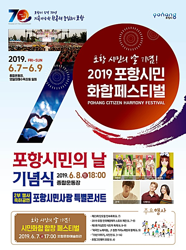 포항시는 오는 6월 8일 18시 포항종합운동장에서 52만 시민의 화합과 새로운 도약을 위한 시승격 70년을 기념하고자 ‘2019 포항시민의날 기념식 및 포항시민사랑특별콘서트’를 성대하게 개최한다.