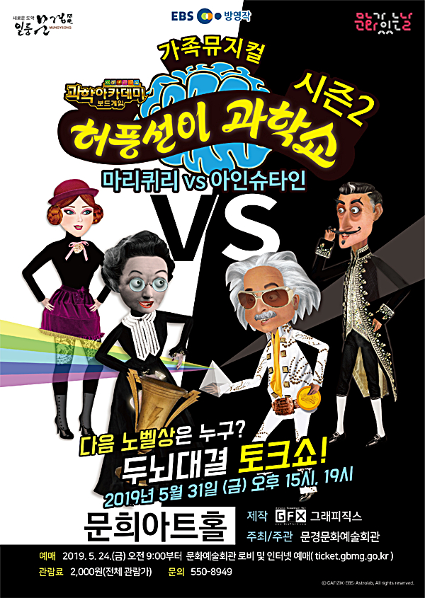 5월 문화가 있는 날(매월 마지막 수요일이 있는 주)은 문경시 어린이를 위하여 TV나 책에서만 보던 과학자들을 직접만나 아이들의 눈높이에 맞게 즐길 수 있는 문화공연 ‘허풍선이 과학쇼 시즌2-마리퀴리VS아인슈타인’이 5월 31일 오후 3시, 7시에 문희아트홀에서 열린다.
