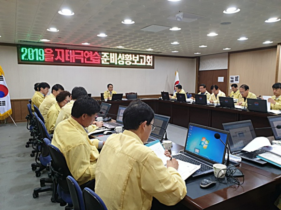 울릉군(울릉군수 김병수)은 오는 27일부터 30일까지 진행되는 을지태극연습의 전반적인 준비상황을 확인 점검하기 위하여 지난 20일 군청 제2회의실에서 간부들이 참석한 가운데 ‘2019년 을지태극연습 준비상황 보고회’를 개최했다.