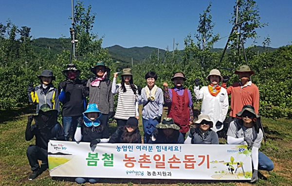 이날 농촌지원과 직원들은 과수적과 지원을 통해 과수농가에 일손을 보태고 농업현장의 애로사항을 청취하며 농업인들과 소통하는 시간도 함께 가졌다.