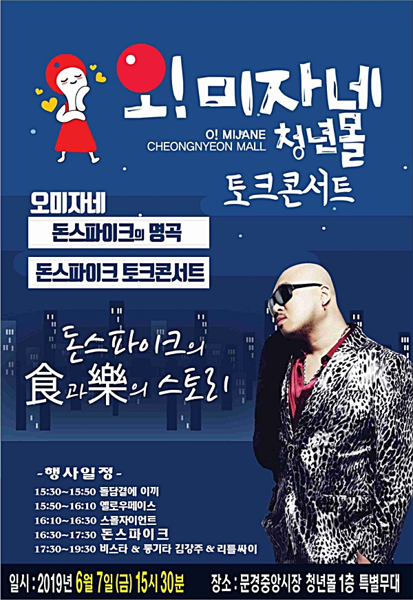 문경시는 문경중앙시장 오!미자네 청년몰 1층 특별무대에서 오는 6월 7일 오후 3시 30분부터 ‘돈스파이크 토크콘서트’가 열린다고 밝혔다.