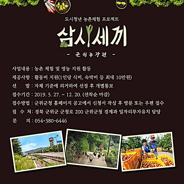 2018년에 이어 두 번째로 진행하는 삼시세끼 사업은 만39세 이하 전국 청년을 대상으로 선착순 100여 명을 선발하여 운영할 계획이다. 참가자에게는 식비, 숙박비 등 실비를 지원하며 참가신청과 문의는 군위군 경제과(380-6446)로 하면 된다.
