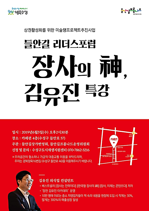 수성구(구청장 김대권)는 오는 5일 오후 2시 30분 들안길 카페 편 4층(수성구 상동 320-6)에서 ‘들안길리더스포럼’을 개최한다.