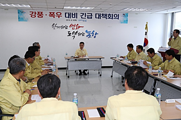이강덕 포항시장은 지난 6일 오전 북구청에서 부시장, 국·소장 등이 참석하는 긴급 대책회의를 주재해, 강풍 및 집중호우로 피해가 발생하지 않도록 각 부서에서 예찰활동과 적극적인 대응을 추진하도록 지시하고 인명피해 및 재난사고가 발생하지 않도록 철저히 대비할 것을 당부했다.
