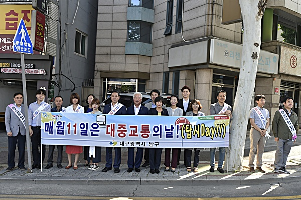 대구광역시 남구청(구청장 조재구)은 11일 오전 8시, 영대병원네거리에서 ‘매월 11일은 대중교통의 날’에 대한 주민들의 관심과 참여를 높이기 위해 ‘대중교통의 날’ 캠페인을 실시했다.