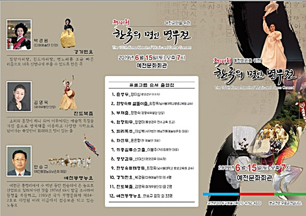 동국예술기획(대표 박동국)이 주최하고 한국명인원이 주관하는 제101회 ‘한국의 명인명무전’이 6월 15일 오후 7시 예천문화회관에서 해설이 있는 춤과 음악으로 예천군민을 찾아간다.