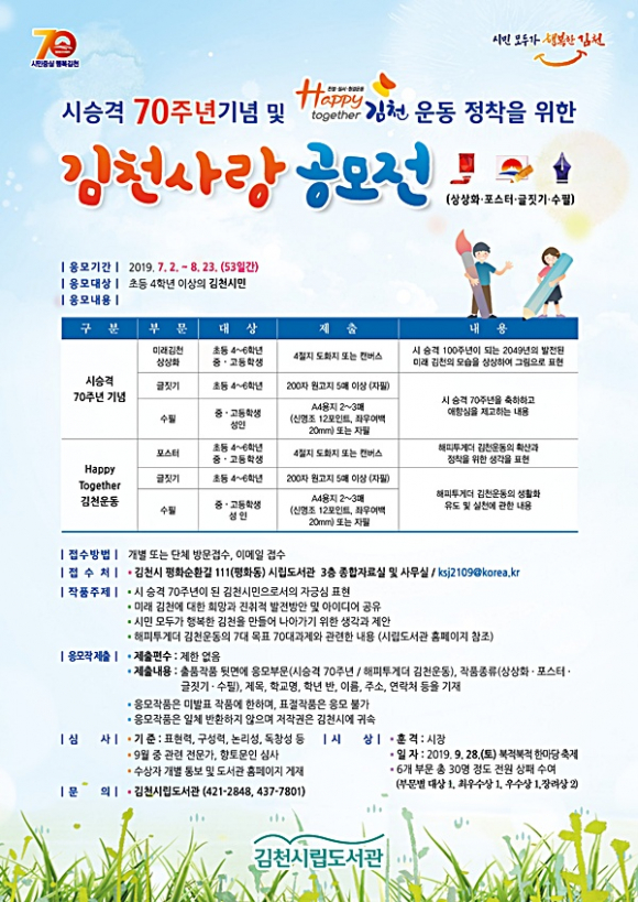 공모부문은 ‘시승격 70주년기념’부문과 ‘Happy together김천운동’부문이 있다.