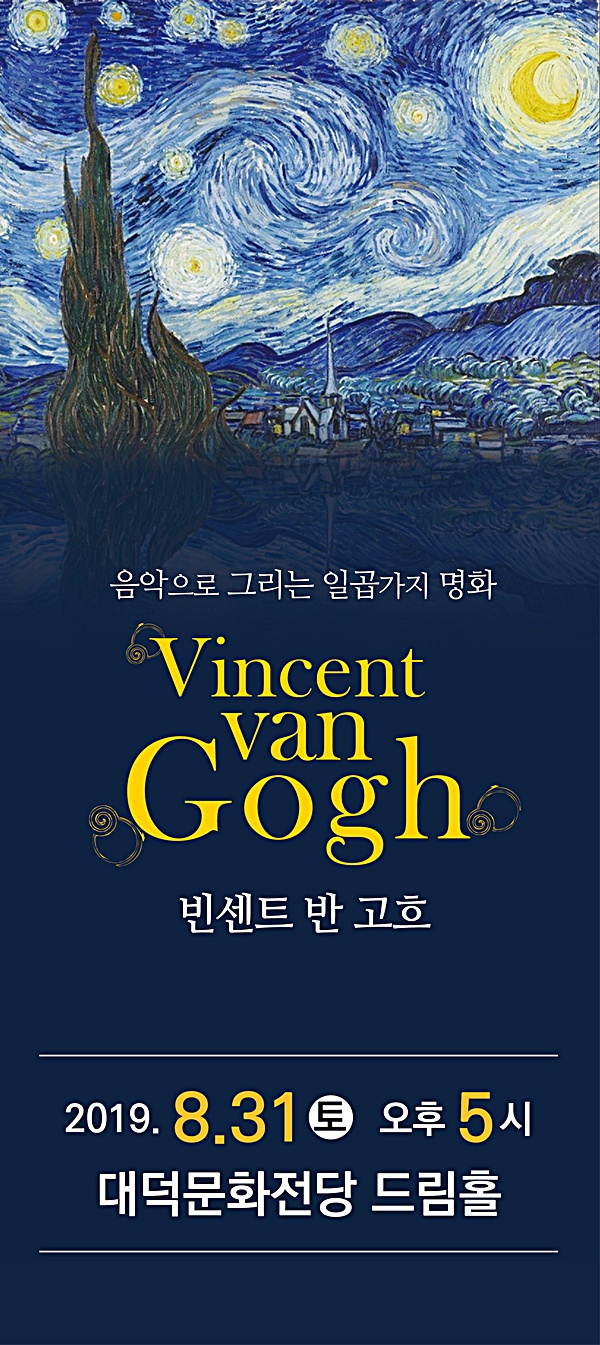 동서양을 막론하고 전세계적으로 사랑받고 있는 화가 빈센트 반 고흐 작품 중 ‘별이 빛나는 밤(1889)’, ‘아를르의 포룸 광장의 까페테라스(1888)’, ‘수확하는 사람(1889)’, ‘귀에 붕대를 감은 자화상(1889)’ 등 7가지 작품을 선정하여 작품에 얽힌 고흐의 예술적 삶과 사랑 이야기를 미술과 음악의 융합으로 만들어낸다.