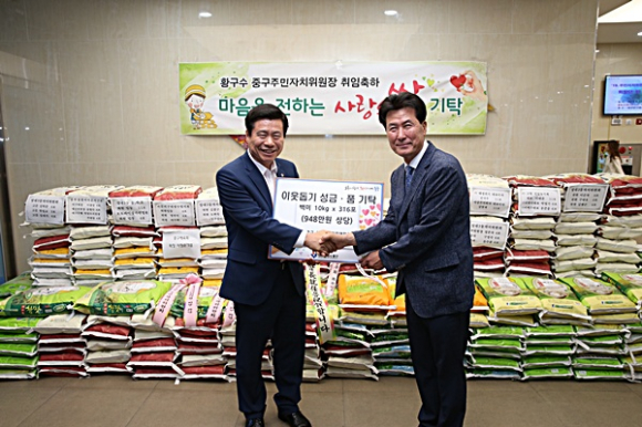 한편, 제5대 주민자치위원연합회장으로 취임한 황구수 신임회장은 취임식을 축하하는 화환대신 기증받은 쌀10kg 316포대(948만원 상당)을 중구 관내 어려운 이웃들을 위해 쓰도록 중구청에 기탁했다. [시군향우회인터넷뉴스=정미진기자]