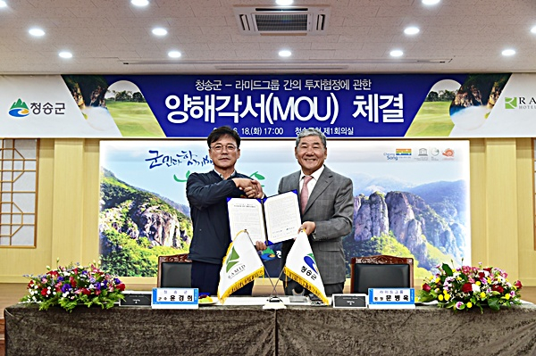 청송군은 지난 6월 18일 군청 제1회의실에서 윤경희 청송군수, 라미드그룹 문병욱 회장, 청송군의회 권태준 의장 등 관계자 60여 명이 참석한 가운데 관광 및 체류형 골프장·숙박시설 건립 사업에 따른 ‘청송군&라미드그룹’ 간의 투자협정에 관한 양해각서(MOU)를 체결했다.