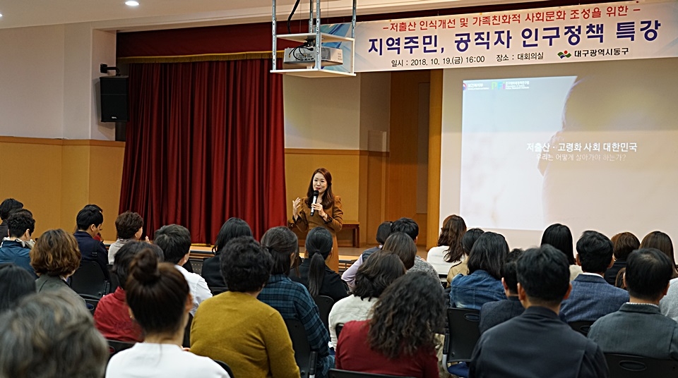 대구 동구청(구청장 배기철)은 지난 19일 지역주민과 직원 등 180여 명을 대상으로 구청 대회의실에서 인구와미래정책연구원 강지영 강사를 초청해 ‘지역주민, 공직자 인구정책 특강’을 개최했다.