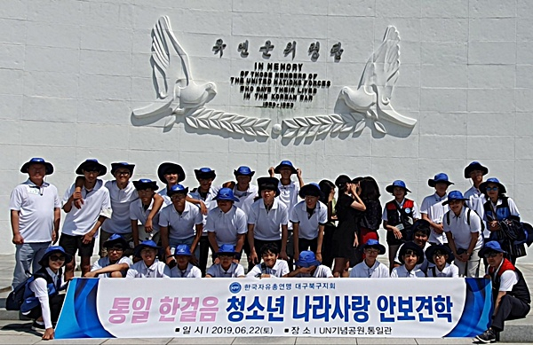 한국자유총연맹대구북구지회(회장 김문룡)는 지난 6월 22일 관음중학교 학생 40여 명과 ‘통일 한걸음’이란 주제로 UN기념공원과 6.25참전 영도유격부대 유적지, 부산통일관등으로 청소년 나라사랑 안보견학을 실시했다.