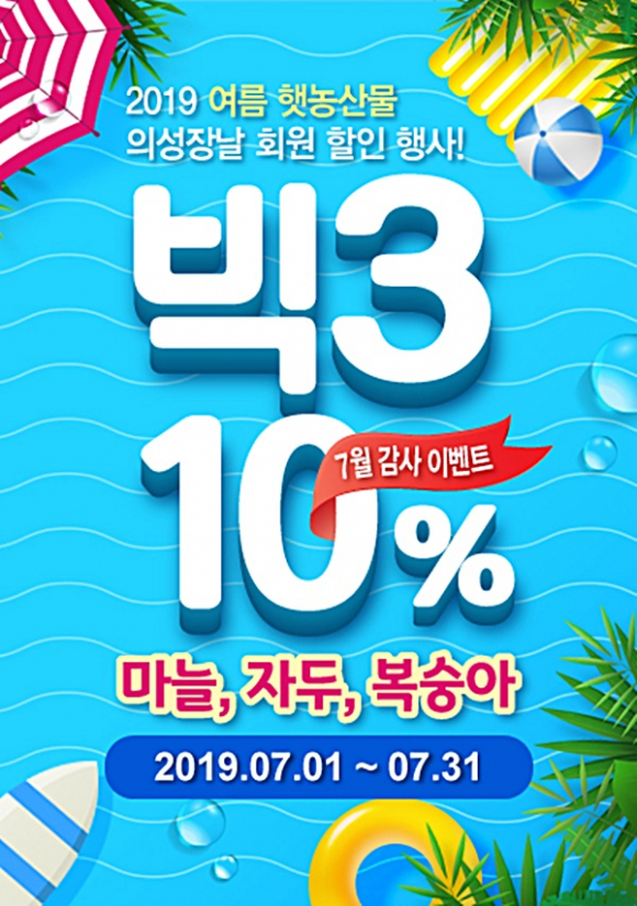 의성군(군수 김주수)은 직거래 농·특산물 쇼핑몰인 ‘의성장날’(http://mall.usc.go.kr)에서 의성군 대표 여름 농산물인 의성마늘, 자두, 복숭아의 본격적인 출하기를 맞이하여 특별 이벤트를 실시한다고 밝혔다.