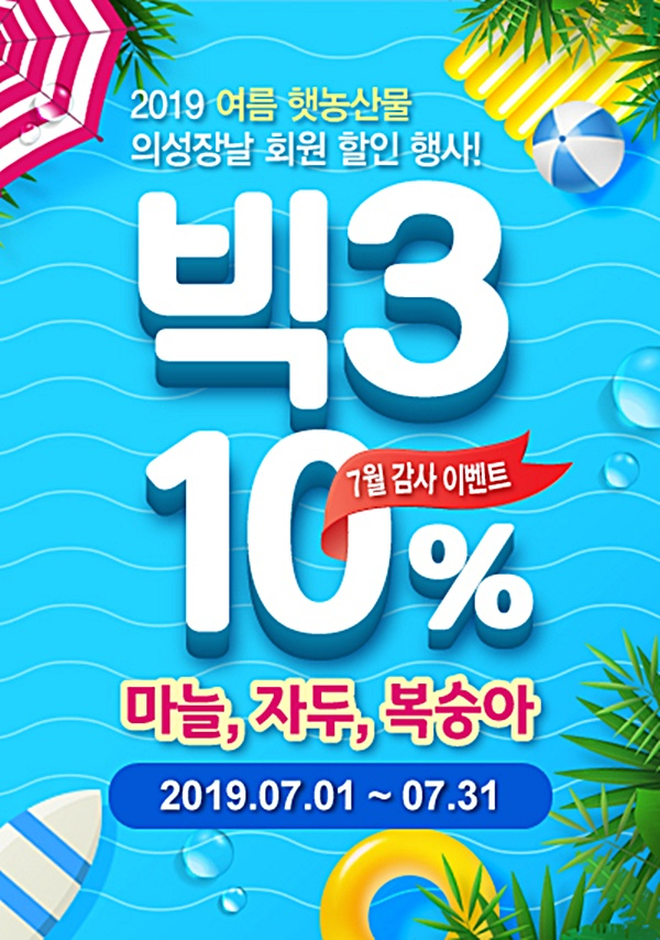 이번 행사는 7월 1일부터 31일까지 한 달간 진행되며, 최고 품질의 여름 농산물을 생산농가와의 직거래를 통해 10% 할인 된 저렴한 가격으로 만나 볼 수 있으며 예약 구매자 대상 감사 이벤트로 10% 적립금을 지급하여 의성군 대표 농산물을 더욱 풍성하게 만나볼 수 있다.