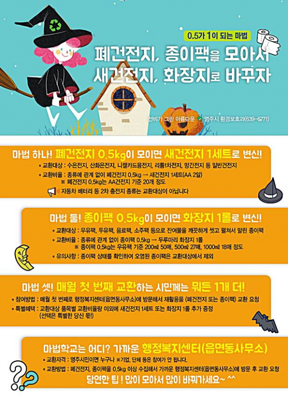 교환방법은 폐건전지와 종이팩 모두 0.5kg 이상씩 모은 다음 가까운 읍면동 행정복지센터를 방문해 새건전지와 화장지로 교환을 요청하면 되고, 무게 0.5kg당 폐건전지는 새건전지 1세트(2알), 종이팩은 두루마리 화장지 1롤로 바꿀 수 있다.