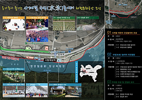 사업의 큰 틀은 크게 세 부문으로 첫 번째는 사계절 어린이 건강놀이터 조성을 테마로 한 수빙(水氷)방방놀이터(트렘볼린, 클라이밍 등)와 수빙설매장(슬로우프 등)을 조성, 두 번째는 수빙 놀이터 리모델링을 테마로 한 빙상장 개보수, 얼름 꽃동산 조성, 가족 낚시 체험장, 다목적 휴게 공간 및 포토존과 조형물 등을 설치, 세 번째는 친환경 주차장 조성과 진입도로 개보수 등이며, 사업 공간 조성에 따른 각종 안전 및 평생교육과 체험 프로그램 등을 운영하게 된다.