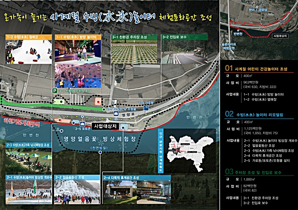 특히 이번에 선정된 지역수요맞춤 공모사업은 지난 4월 서면심사 및 컨설팅, 5월 현장평가 심사, 6월 최종 심사에 거쳐 7월 초 최종 확정·선정 됐으며, 본 사업은 지역 어린이들을 위한 프로젝트 사업으로 기존에 운영해오던 반변천 무료 스케이트장을 온 가족이 즐기는 사계절 수빙(水氷)놀이터 체험문화 공간으로 새롭게 탈바꿈하게 된다.