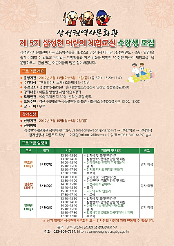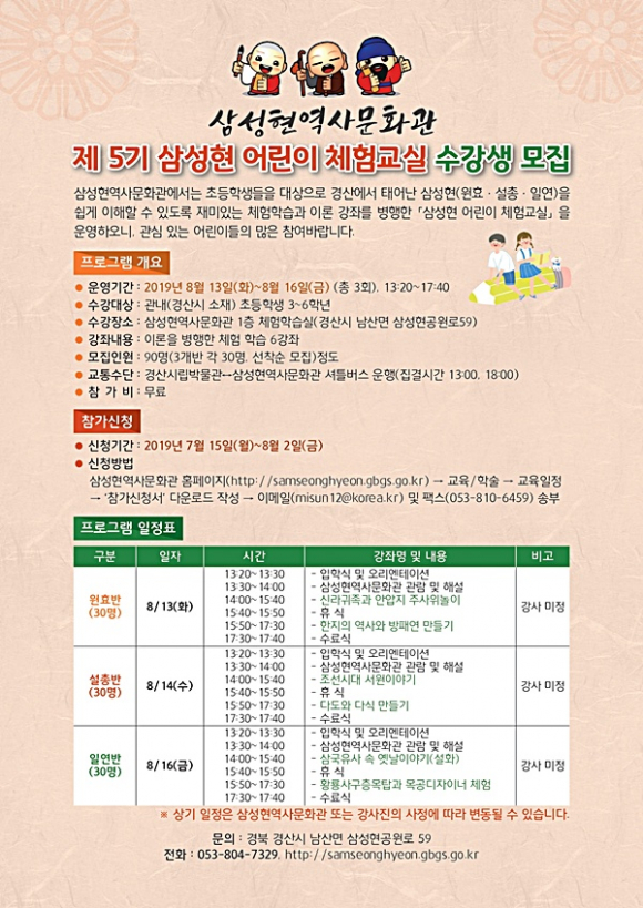 운영 기간은 8월 13일 ~ 16일이며, 원효·설총·일연 각 반별로 총 3회 실시한다. 각 반 30명씩 약 90명 정도를 선착순 모집하며, 접수는 7월 15일 ~ 8월 2일까지, 삼성현역사문화공원 홈페이지(http://samseonghyeon.gbgs.go.kr/)에서 신청서를 다운로드해 작성한 후 이메일(misun12@korea.kr) 또는 팩스 (053-810-6459)로 송부하면 된다.