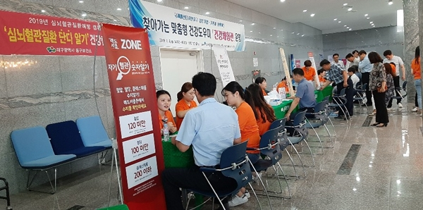 대구 동구보건소는 대구경북경제자유구역청 및 국제패션디자인지구 입주기업·기관의 30~50대 직원 100여 명을 대상으로 7월 8일 DTC(대구텍스타일콤플렉스) 1층 로비에서 ‘심뇌혈관질환 단디 알기’ 건강캠페인으로 건강 체험관 및 홍보관을 운영했다.