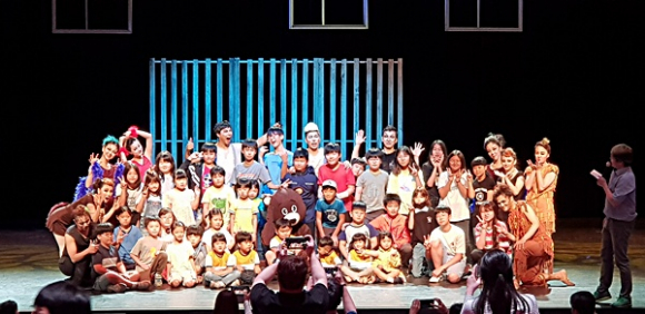 공연이 끝난 후 어린이들은 출연배우들과 무대 위에서 기념사진을 촬영하며 좋아했다. [시군향우회인터넷뉴스=정미진기자]