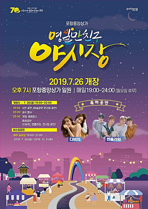 포항시는 야시장이 운영되는 실개천거리에 파빌리온, 스테인드글라스, 조명 등 화려한 경관을 조성하는 한편, 26일 개최되는 개장행사에는 다비치, 엔 플라잉이 펼치는 축하공연을 준비하여 방문객들의 눈과 귀를 사로잡을 것으로 기대된다.