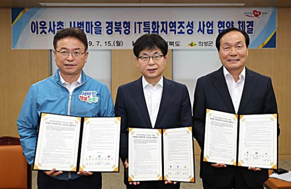 의성군(군수 김주수)은 지난 7월 15일 경북도청에서 이철우 경상북도지사, 김주수 의성군수, 윤종진 KT홍보실장 등 3개 기관 관계자가 참석한 가운데 이웃사촌 시범마을 조성사업과 연계한 경북형 IT특화지역 조성사업 양해각서를 체결했다.