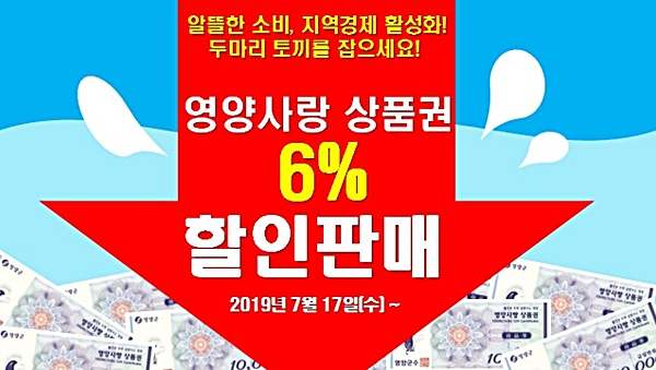 영양군(군수 오도창)은 가계에 보탬이 되고, 지역 내 소비를 촉진시켜 지역경제 활성화를 기대할 수 있는 지역화폐인‘영양사랑 상품권’을 지난 7월 17일부터 할인하여 판매하기로 했다.