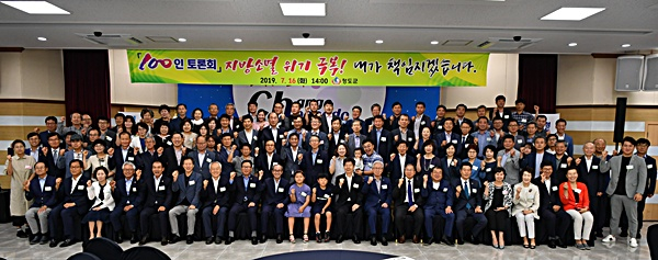 청도군(군수 이승율)은 지난 7월 16일 군청 대회의실에서 이승율 군수, 청도군의회 박기호 의장과 의원, 이재훈 경북테크노파크 원장, 이효수 전 영남대학교 총장을 비롯한 대학교수, 연구원, 공무원 등 200여 명이 참석한 가운데 민선 7기 1주년을 맞이하여 저출산 인구감소에 따른 지방소멸 위기를 슬기롭게 극복하고자 대군민 소통의 장(場)인 ‘100인 토론회’를 개최하여 20시 40분까지 각 분야별 열띤 토론을 펼쳐 10대 분야 100대 과제를 선정했다.