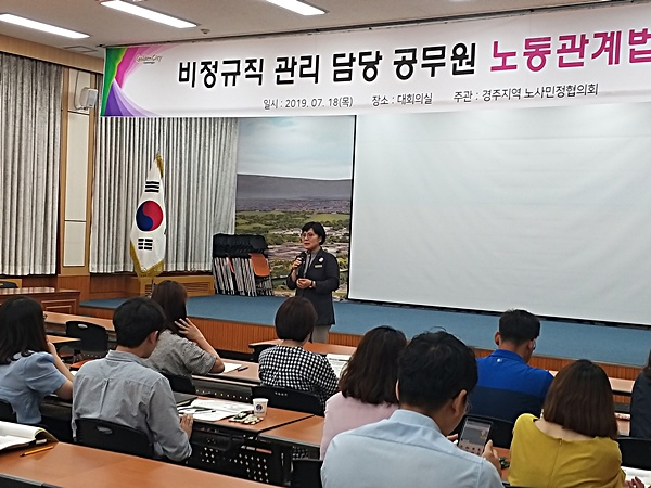 경주시와 경주지역 노사민정협의회 사무국은 18일 대회의실에서 시 공무원과 산하기관 직원 100여 명을 대상으로 노동관계법 교육을 실시했다.