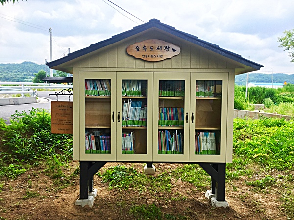 500여 권의 도서가 비치된 숲속도서관은 연중 이용 가능한 무인 야외 서가이다. 자연을 찾은 누구든지 보고 싶은 책을 꺼내 읽고 갈 때는 다시 꽂아두고 가면 된다. [시군향우회인터넷뉴스=정미진기자]