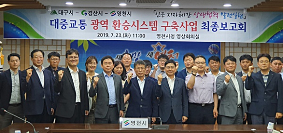영천시(시장 최기문)는 대중교통 광역 무료 환승추진을 위해 지난해 12월 4일 대구시-경산시-영천시 간 대중교통 광역 무료 환승업무협약을 시작으로 환승시스템 구축사업의 진행 및 향후 일정을 포함한 최종보고회를 지난 7월 23일 시청 영상회의실에서 개최했다.