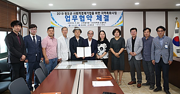 청도군(군수 이승율)은 지난 7월 23일 관내 6개 (예비)사회적기업 대표가 참석한 가운데 청도군과 사단법인 지역과 소셜비즈와의 2019 자치단체 지역특화사업인 ‘청도군 사회적기업 인식확산을 위한 맞춤형 홍보영상 및 우수콘텐츠 제작 지원사업’ 협약식을 체결했다고 밝혔다.