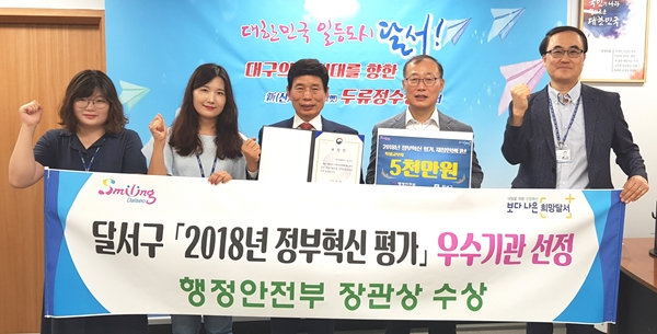 대구 달서구(구청장 이태훈)는 행정안전부 주관 ‘2018년 정부혁신 평가’에서 우수기관으로 선정돼 재정인센티브 5천만원과 ‘행정안전부장관 기관표창’을 수상했다고 밝혔다.