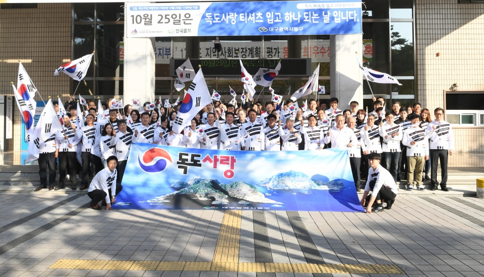 대구 동구(구청장 배기철)에서는 지난 25일 독도의 날을 맞이하여 전 직원이 독도사랑 티셔츠를 입고 출근할 것을 적극 독려하고 오전 9시 배기철 동구청장을 포함한 간부 공무원 및 직원들이 구청사 앞에서 나라사랑과 독도수호의 의지를 다짐하는 퍼포먼스를 실시했다.
