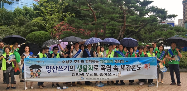 수성구(구청장 김대권)는 지난 7월 23일 범어네거리에서 폭염 예방대책의 하나로 ‘양산쓰기 생활화 홍보 캠페인’을 실시했다.