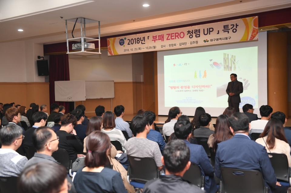 대구 동구청(구청장 배기철)은 2018년 10월 25일부터 29일까지 3회에 걸쳐 전체 직원을 대상으로 공무원으로서의 알아야 할 청탁 금지 법과 공무원 행동 강령을 청렴연수원 전문강사를 초빙하여 사례를 중심으로 『청렴 교육』을 실시하고 있다.