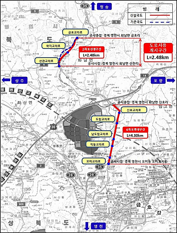 영천시는 부산지방국토관리청에서 시행중인 영천~삼창 국도건설공사(국도35호선)와 관련해 화남면 선천리(선관교차로)~화남면 금호리(금호교차로) 신설2차로 2.48km구간에 대해 다음달 1일 낮 12시를 기해 조기 개통한다.