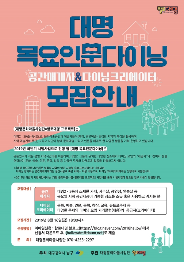 대명 목요인문다이닝 참가신청 및 문의는 대명문화마을사업단(070-4253-2297) 및 할로대명 블로그(blog.naver.com/2018hallow)로 하면 된다.