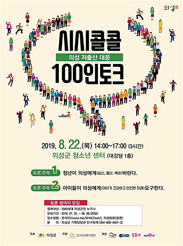 의성군(군수 김주수)은 오는 8월 22일, 군민들이 직접 저출산 대응책을 도모하기 위한 ‘시시콜콜 100인 토크’를 개최한다고 밝혔다.