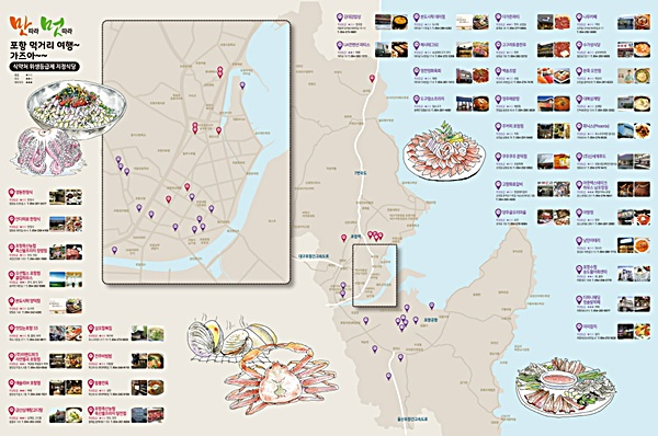 맛지도에는 포항시 위생등급 우수 음식점과 공중위생서비스 최우수 숙박업소를 수록하고 아름다운 포항 12경을 여행정보에 담았으며, 맛지도를 시 홈페이지와 지역 내 음식점, 숙박업소, 관광안내소등 여러 곳에 비치해 홍보할 예정이다.