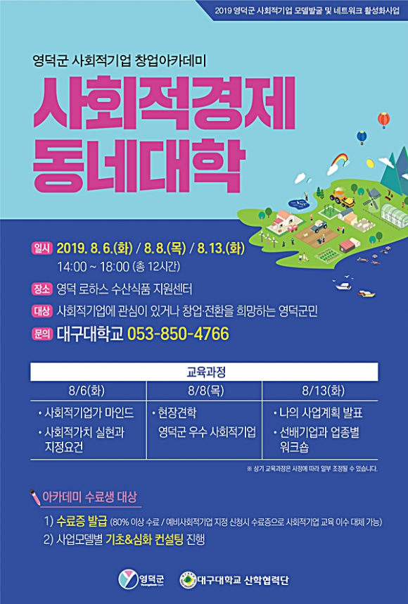 영덕군과 대구대학교 산학협력단(단장 박세현)은 오는 8월 6일 영덕 로하스수산식품센터 대회의실에서 사회적기업의 창업 및 전환을 돕기 위한 ‘사회적기업 창업아케데미 사회적경제 동네대학’을 개강한다고 밝혔다.