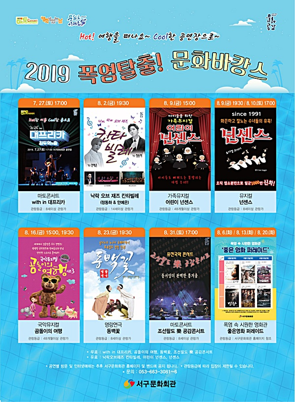 서구문화회관(관장 박원숙)에서는 한 여름 8월을 맞아 매주 공연이 있는 폭염탈출! 시원한 문화바캉스를 선보인다.