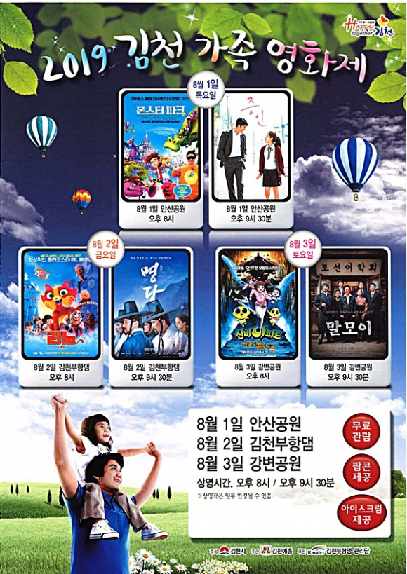 김천시 안산공원과 강변공원, 부항댐 산내들공원에서 만날 수 있는 시원하고도 이색적인 영화관 ‘2019 김천가족영화제’가 지난 8월 1일부터 3일까지 열린다. 가족과 함께 즐길 수 있는 영화제로 하루에 2편씩 총 6편의 영화를 무료로 상영한다.