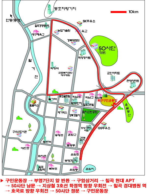 대회 일정은 10월 27일 오전 9시 식전행사를 시작으로 북구 구민운동장에서 출발하여 50사단, 칠곡경대병원역을 경유하여 구민운동장으로 되돌아오는 코스이며, 참가자 전원에게는 기념 티셔츠가 제공되고 참가자들을 위하여 국밥, 두부 등 먹거리도 제공될 예정이다.