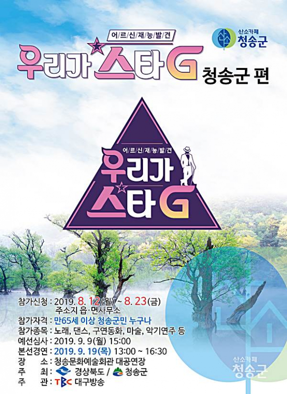 청송군(군수 윤경희)은 9월 19일 청송문화예술회관 대공연장에서 개최되는 ‘우리가 스타-G’ 참가자를 모집한다.
