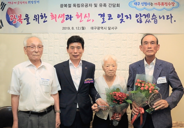 대구 달서구(구청장 이태훈)는 지난 8월 12일 관내식당에서 조국 광복을 위해 희생하신 생존애국지사와 독립유공자 유족 40여 명을 초청하여 간담회를 개최하고 광복정신 계승에 이바지한 분들에게 표창을 수여했다.